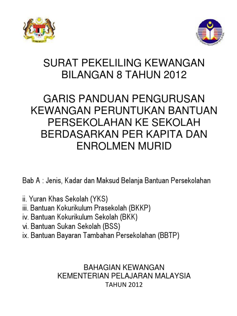 SURAT PEKELILING KEWANGAN BILANGAN 8 TAHUN 2012 Garis Panduan Pengurusan Kewangan Peruntukan Bantuan Persekolahan ke Sekolah Berdasarkan Per Kapita. 82016 bertarikh 2 November 2016 adalah dirujuk. KPBKEWBT1800G-03 JLD2sk 6.